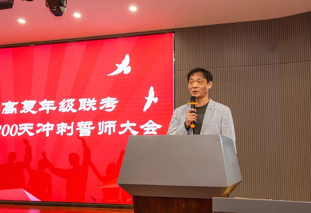 袁德平老师作为教师代表发言,随着高考的脚步临近,同学们的焦虑感也与日俱增,但希望同学们能回忆起刚入校园的那份执着与坚定,用信心来战胜恐惧。并且,同学们要坚信自己并不是孤军奋战,高复所有老师都陪伴着同学左右,不在身旁的父母也在为同学们加油鼓劲。夜深人静之时,不如幻想大学的美好生活,让对大学的憧憬为自己加加“油”,最后,他希望大家能明确目标,细化任务,沉浸学习,心无旁骛。